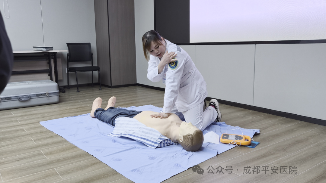随后,急诊科护士长刘世蓉结合理论知识与现场演示,细致拆解心肺复苏的操作要点。她重点讲解了“黄金四分钟”的积极意义:心脏骤停后,人体脑组织会在缺氧4分钟内开始发生不可逆损伤,超过 10分钟基本失去抢救希望,而及时有效的心肺复苏能维持脑部最低供氧,为专业医护人员到场赢得关键时间。